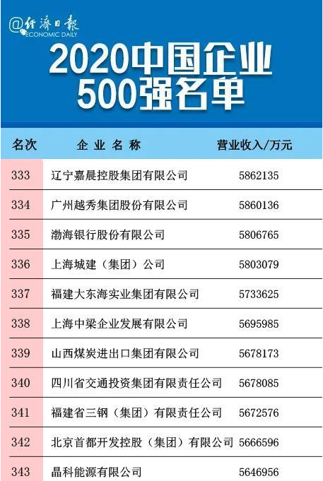 2020中國企業(yè)500強出爐 嘉晨集團排名333位