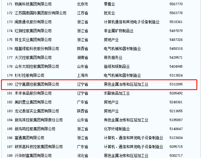 9月25日,以“新征程 新使命 新作為:全力推進(jìn)大企業(yè)高質(zhì)量發(fā)展”為主題的2021中國(guó)500強(qiáng)企業(yè)高峰論壇在中國(guó)長(zhǎng)春市舉行。中國(guó)企業(yè)聯(lián)合會(huì)、中國(guó)企業(yè)家協(xié)會(huì)向社會(huì)發(fā)布“中國(guó)企業(yè)500強(qiáng)”名單,遼寧嘉晨控股集團(tuán)榜單排名374位。